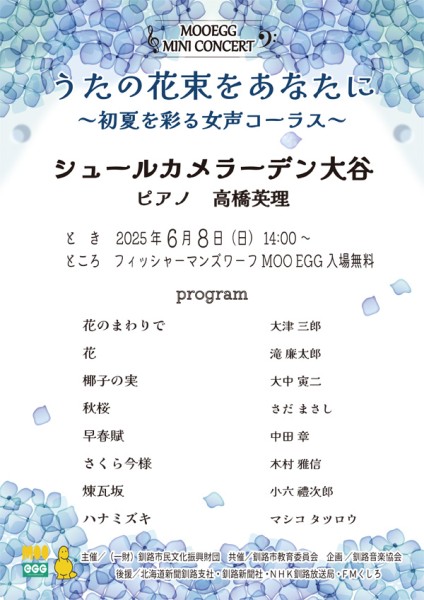 6月8日(日)午後2時より「MOO EGGミニコンサート」を開催いたします。今回はうたの花束をあなたに~初夏を彩る女性コーラス~と題しまして、シュールカメラーデン大谷によりますコーラスをお届けいたします。ピアノ伴奏は高橋英理さんです。