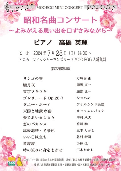 今回は「昭和名曲コンサート」~よみがえる思い出を口ずさみながら~と題しまして、美空ひばり、山口百恵、テレサテンなど懐かしの昭和の名曲を中心のプログラムとなっています。ピアノは高橋英理さんです。