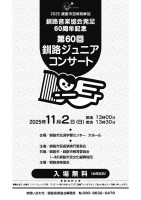 11月2日(日)13時30分より釧路市生涯学習センター大ホールにおきまして、釧路音楽協会発足60周年記念、第60回釧路ジュニアコンサートを開催いたします。入場無料となっており、今年は小学4年生から高校3年生まで...