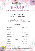 8月25日(日)午後2時より「MOO EGGミニコンサート」を開催いたします。8月は「私の愛唱歌 」~夏の名残・秋が来る前に~と題しまして日本のなじみ深い曲やシューベルト、ガーシュインなどソプラノ泉洋...